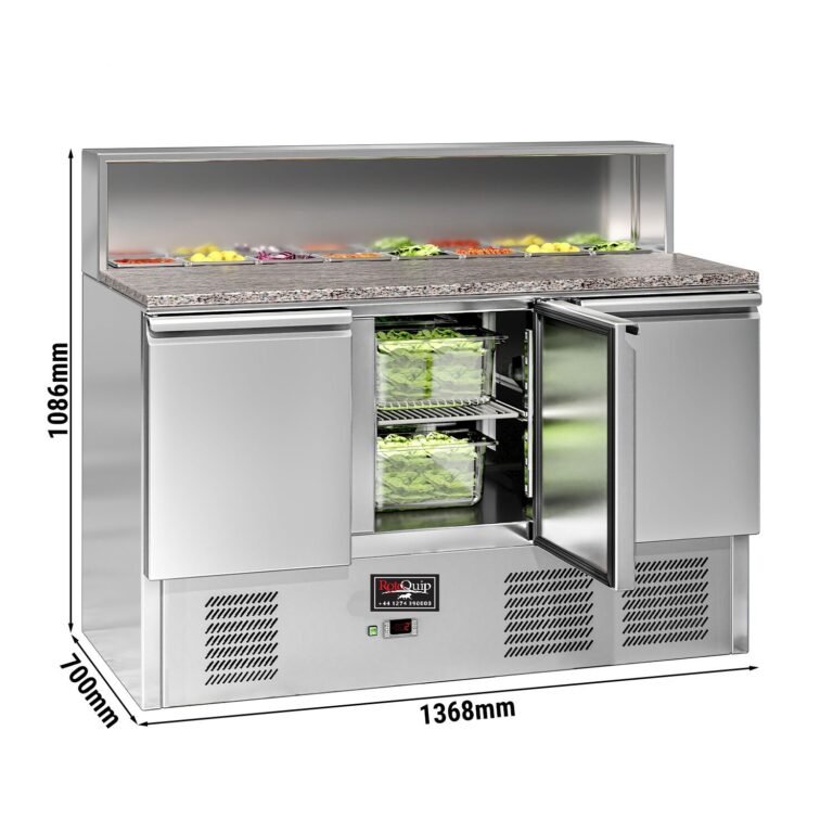 3 solid hinged doors open up to the chiller section of the counter. The doors have a self-closing function which helps maintain the conditions inside the chiller by preventing you from accidentally leaving the door open. The unit then supplies an even stream of cold air within the fridge through a fan assisted cooling system which provides temperatures ranging between 2°C to 8°C.
