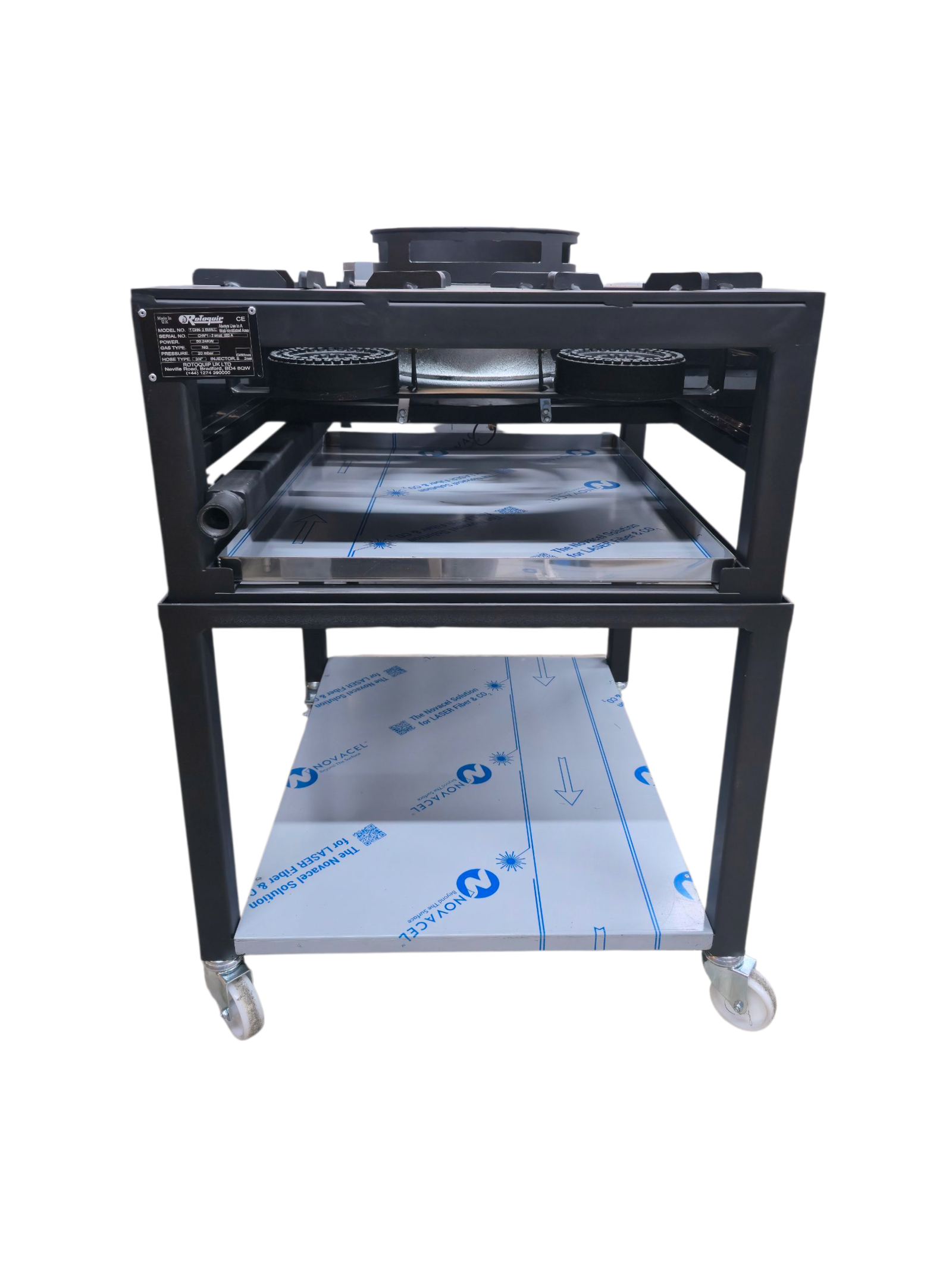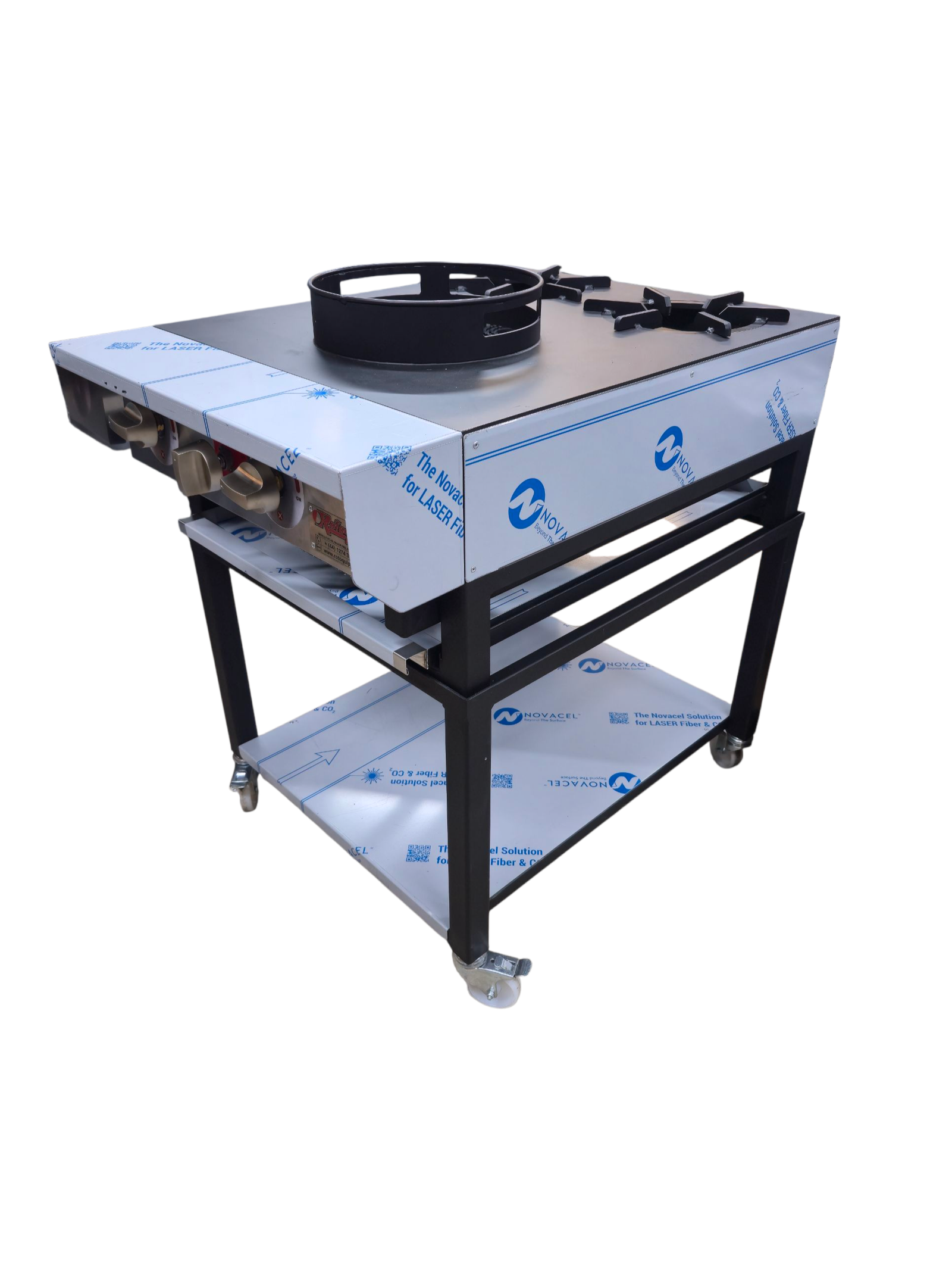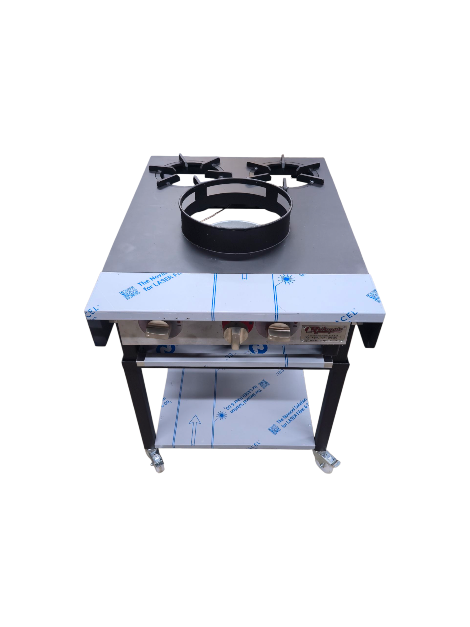 The solid plate provides stability while cooking, and the welded stainless steel ring holds the wok securely in place. For ease of movement and cleaning, the cooker is built on castors, offering both functionality and convenience.